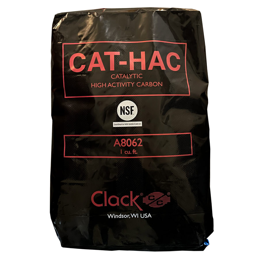 Clack Catalytic Activated Carbon is a high activity coconut shell based granular carbon that is specifically designed for the reduction of chloramines and hydrogen sulfide from potable water. Manufactured from select grades of coconut shell coal to produce a high density, durable granular product capable of withstanding the abrasion and dynamics associated with repeated hydraulic transport, backwashing and mechanical handling. Activation is carefully controlled to produce exceptionally high internal surface area with optimum pore size for the adsorption of a broad range of low molecular weight organic contaminants and oxidizing agents like chlorine and ozone. The catalytic activity of CAT-HAC makes it highly effective for the reduction of chloramines and hydrogen sulfide from potable water. Its large micropore volume also makes it particularly well suited for the removal of low molecular weight organic compounds and their chlorinated by-products such as chloroform and other trihalomethanes (THMs). To obtain maximum efficiency of the activated carbon in the adsorption process, it is desirable to have the greatest possible surface area in the smallest practical volume. This is necessary because the rate of adsorption is proportional to the amount of surface area of the adsorbing media. CAT-HAC has a surface area of 1,060 square meters per gram. This results in high efficiency and greater system economy. Clack has for many years provided activated carbon to the OEM and replacement market as a pre-treatment for other water purification systems as well as for use in individual treatment equipment for the removal of specific impurities. CAT-HAC requires dissolved oxygen concentration of 4ppm (mg/L) to insure effective removal of iron and hydrogen sulfide. CAT-HAC requires periodic backwashing to eliminate accumulated suspended matter and to re-grade the filter bed. CAT-HAC has an extremely high capacity but must be replaced when the filter bed loses the capacity for reduction of chloramines and hydrogen sulfide. CAT-HAC may be used in either domestic or industrial applications using gravity flow or pressurized filter vessels. Features: